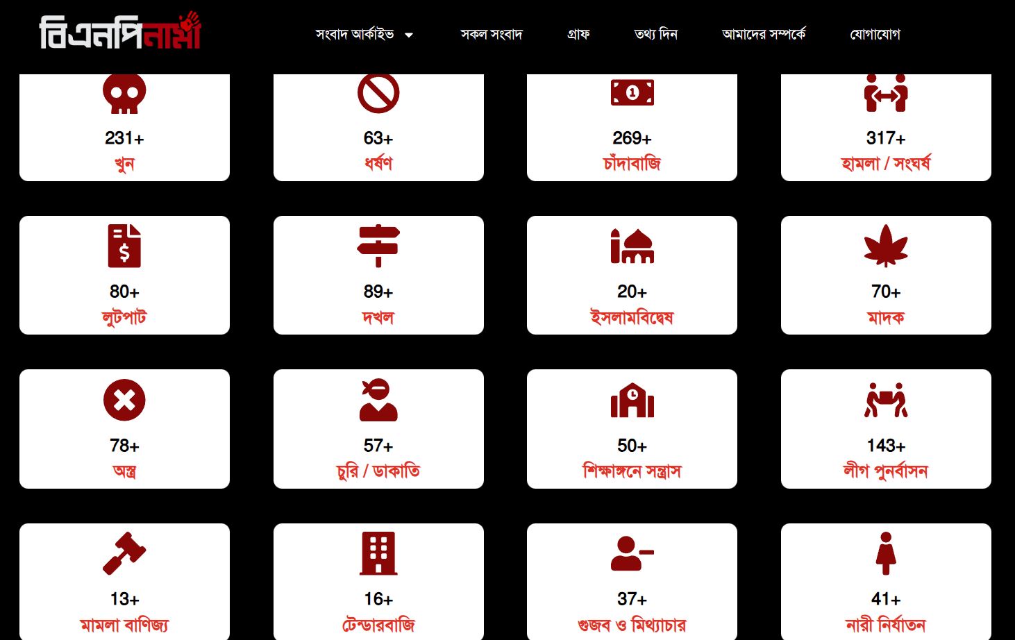 গণঅভ্যূত্থানের পর ২৩১ খুন, ৬৩ ধর্ষণ ও ২৬৯ চাঁদাবাজি ছাড়াও অন্য অপকর্মের তথ্যও উঠে এসেছে ওয়েবসাইটটির তথ্যে। এছাড়া ৩০৯ টি হামলা / সংঘর্ষ, ৮০টি লুটপাট, ৮৯ টি দখল, ২০ টি ইসলামবিদ্বেষ ছড়ানো, মাদক ৭০, ৭৫ টি অস্ত্র উদ্ধার, ৫৭ টি চুরি-ডাকাতি, ৫০ টি শিক্ষাঙ্গনে সন্ত্রাস, ১৪১ টি লীগ পুনর্বাসন, ১৩ টি মামলা বাণিজ্য, ১৬ টি টেন্ডারবাজি, ৩৫ টি গুজব ও মিথ্যাচার, ৪১ টি নারী নির্যাতন, ৭ টি দুর্নীতি, ২৩ টি হুমকি ও ১২ টি গণতন্ত্রে বাধার ঘটনা স্থান পেয়েছে।